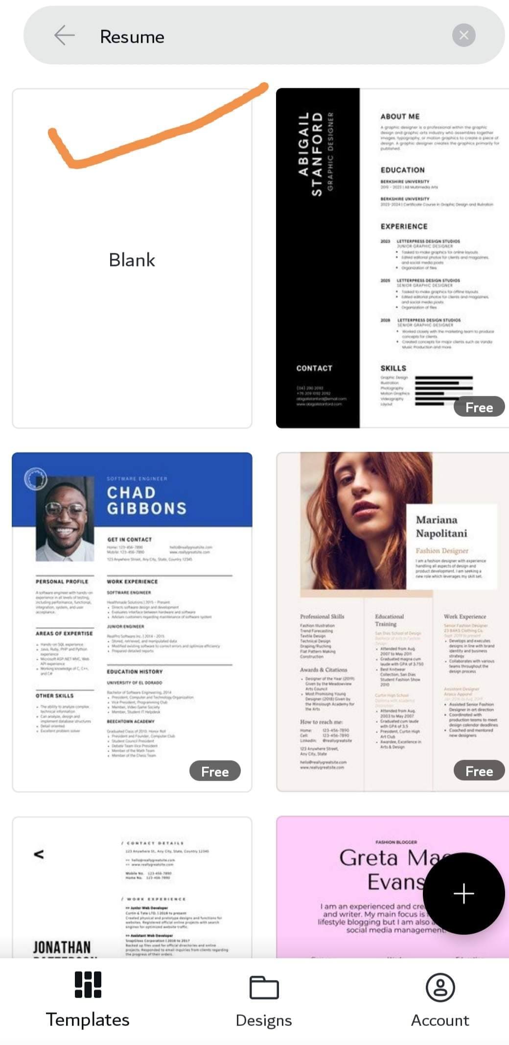 - تظهر لنا نماذج سيرة ذاتية جاهزة للتعديل , نختار النموذج الذي نراه مناسبًا لنا, ومن ثم نضغط عليه.