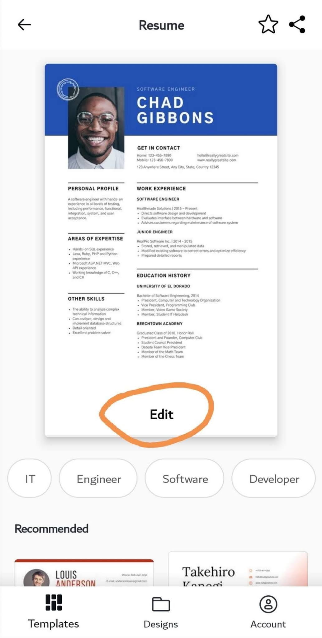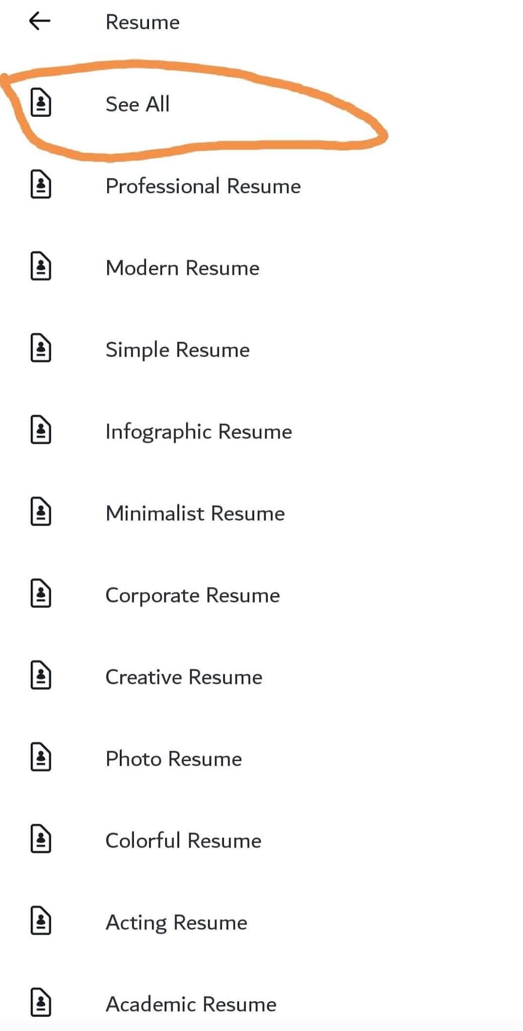 - تظهر لنا جميع أنواع السير الذاتية التي يمكنك تصميمها والتعديل عليها بإستخدام التطبيق, ولكن الأفضل نختار See all كما بالصورة السابقة.